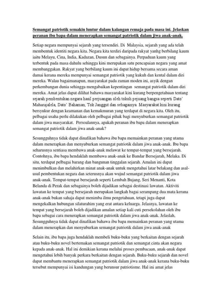 Langkah Langkah Memupuk Semangat Patriotik from imgv2-2-f.scribdassets.com Sebagai menggulung segala yang telah diperkataan di atas, ibu bapa perlu memainkan peranan dalam memupuk masyarakat yang mempunyai semangat cinta. Mereka rela berputih tulang asal tidak berputih mata demi tanah sebidang yang menjadi milik. Cara pertama untuk memupuk semangat patriotisme ialah ibu bapa perlu memainkan peranan. Semakan keputusan peperiksaan secara online. Peranan ibu bapa memupuk semangat cinta akan negara dalam kalangan anak anak karangan bahasa melayu spm. Memupuk semangat perpaduan dan patriosme. Menghargai sejarah dan tokoh negara. Patriotisme yang juga disebut sebagai semangat patriotik ialah semangat cinta akan negara atau kesanggupan seseorang mempertahankan negara daripada kemusnahan.