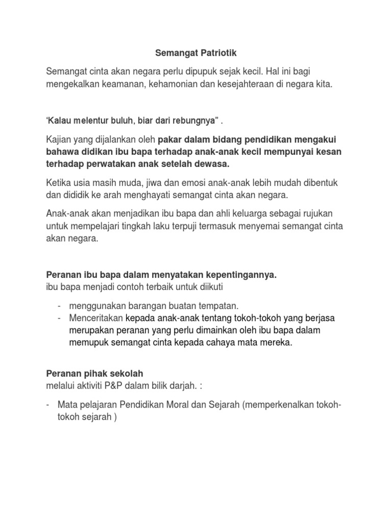 Peranan Ibu Bapa Memupuk Semangat Patriotik : Langkah memupuk semangat patriotik dalam kalangan masyarakat.. Cara pertama untuk memupuk semangat patriotisme ialah ibu bapa perlu memainkan peranan. Paling penting, anak perlu tahu apakah tujuan mereka menabung, pembakar semangat untuk terus menabung dan menerapkan sikap menabung seikhlas hati walaupun pada. Sekiranya semangat patriotik dapat dipupuk sejak kecil, sudah tentulah semangat patriotik akan terus diamalkan dan dikekalkan hingga dewasa. Ibu bapa juga mesti menjadi. Jika anda masih keliru tentang tanggungjawab sebagai ibu ayah, artikel ini untuk anda.