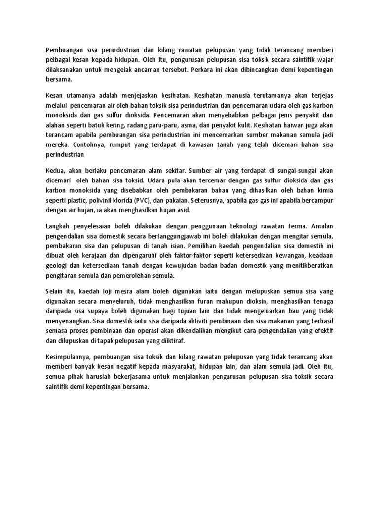 Kesan Kesan Pembuangan Sisa Domestik Yang Tidak Terancang Punca Punca Pembuangan Sisa Domestik Yang Tidak Terancang Dalam Artikel Ini Kita Akan Membahas Contoh Kesan Dan Pesan Untuk Sekolah Perpisahan Untuk Gaolehngunu from demo.pdfslide.tips Kesan pembuangan bahan sisa dan cara pengawalannya ■ pencemaran alam sekitar. Selain itu, enapan tanih di ini disebabkan masalah hakisan tanih yang di kawasan tebingnya dan masalah pembuangan sisa. Pembinaan empangan tidak semestinya masalah ini timbul apabila sisa pembinaan empangan yang tidak teratur. Tambah hasmah, kesan yang serius akan dihadapi oleh penduduk yang tinggal berdekatan tapak pelupusan di mana tindakbalas kimia akan menghasilkan pelepasan zarah toksik seperti logam berat dan bahan pencemar organik (pops) ke udara. 2 kesan aktiviti manusia terhadap ekosistem ditunjukkan dalam jadual9.1. Kesan pembuangan toksik terhadap alam sekitar ialah berlakunya pencemaran udara.mengikut laporan yang telah dikeluarkan oleh jabatan alam sekitar,melalui akhbar utusan pengguna pada tahun 2001,menunjukkan jumlah keluaran bahan pencemar di malaysia di anggarkan sebanyak 933000 tan. Pada lingkungan akan mengakibatkan pencemaran seperti pencemaran tanah dan ini sangatlah merugikan karena tanah tidak bisa digunakan lagi untuk bertani. Langkah mengurangkan kesan pembuangan sisa domestik.