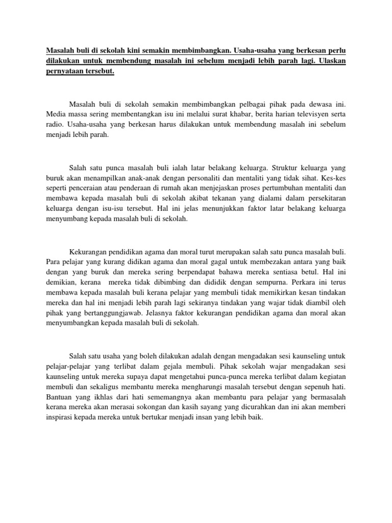 Kes buli yang melibatkan pelajar sekolah bukanlah kes terpencil kerana kes ini sudah mendapat perhatian seluruh masyarakat negara kita. Dalam sesetengah kes, mangsa buli akan enggan ke sekolah, tidak. Ia susulan sebuah video yang tular memaparkan seorang murid lelaki dipukul oleh tiga orang murid lain dalam kejadian dipercayai berlaku di besut, terengganu, rabu lalu. Masalah ini bukan sahaja boleh menjejaskan pencapaian akademik pelajar malah pelbagai kerenah di dalam bilik darjah mengundang kepada ketidaklancaran pengajaran dan pembelajaran di bilik darjah di samping menimbulkan masalah kepada pihak pentadbir. Mempunyai harga diri yang rendah; Menunjukkan bahawa pelajar yang melakukan kes buli ini mempunyai masalah terutama dari segi persekitaran, keluarga atau emosi. Penyelidikan telah menunjukkan bahawa mangsa buli lebih cenderung untuk: Pembentukan polisi bagi menangani dan mencegah tingkah laku buli di sekolah seperti polisi antibuli. Berikut adalah contoh karangan gejala buli di sekolah sebagai panduan dan rujukan para pelajar. Kajian mendapati tidak terdapat perbezaan yang signifikan antara tingkah laku buli di kalangan pelajar sekolah menengah dan sekolah rendah dan Saiz masalah buli • peratusan kes dibuli adalah lebih tinggi di sekolah rendah jika berbanding dengan sekolah menengah. Apa yang membimbangkan kini ialah isu buli yang melibatkan pelajar semakin berleluasa dan kejam. Kita tidak boleh berada dalam keadaan penafian setiap kali berlaku masalah di sekolah.