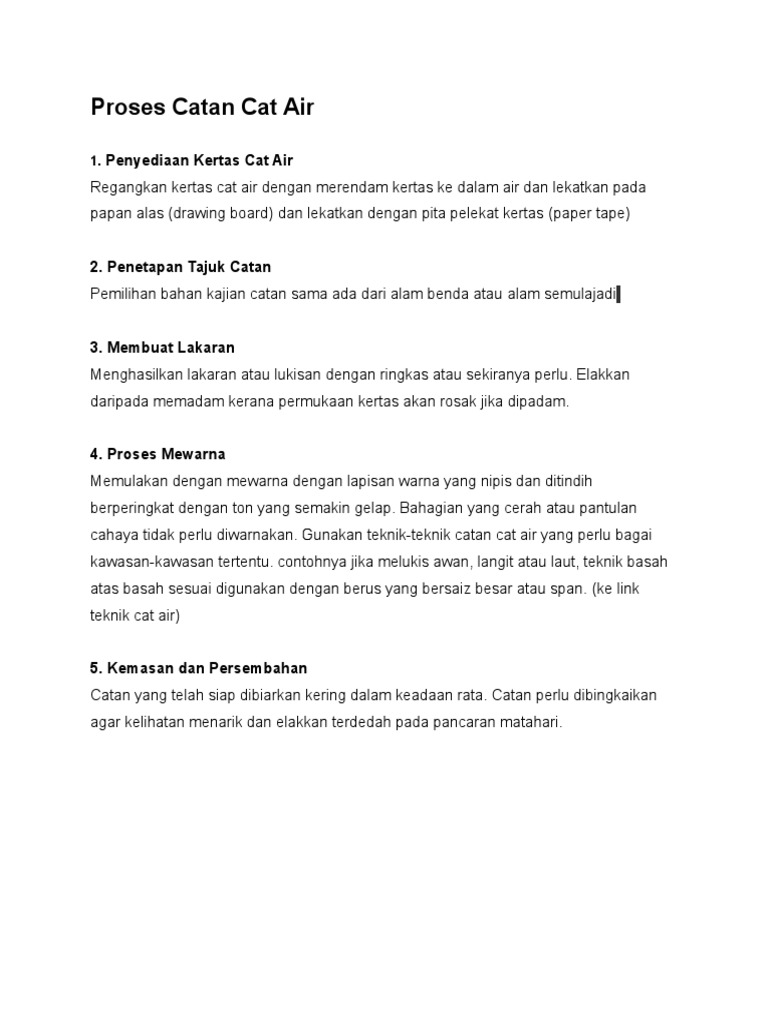 Rancangan pengajaran dan sukatan psv; Catan adalah satu proses menyapu warna atau cat ke atas sesuatu permukaan rata. aram akan menyerap sebahagian warna cat air dan menghasilkan kesan+kesan jalinan bertompok dengan spontan. Catan ± merupakan hasil karya 2d dengan penggunaan pelbagai teknik dan bahan pewama seperti cat yang memerlukan bahantara air dan minyak. Teknik catan cat air mp3 files source planetlagu, metro lagu, bursamp3, gudang lagu, lagu76, atau stafaband untuk keperluan review.