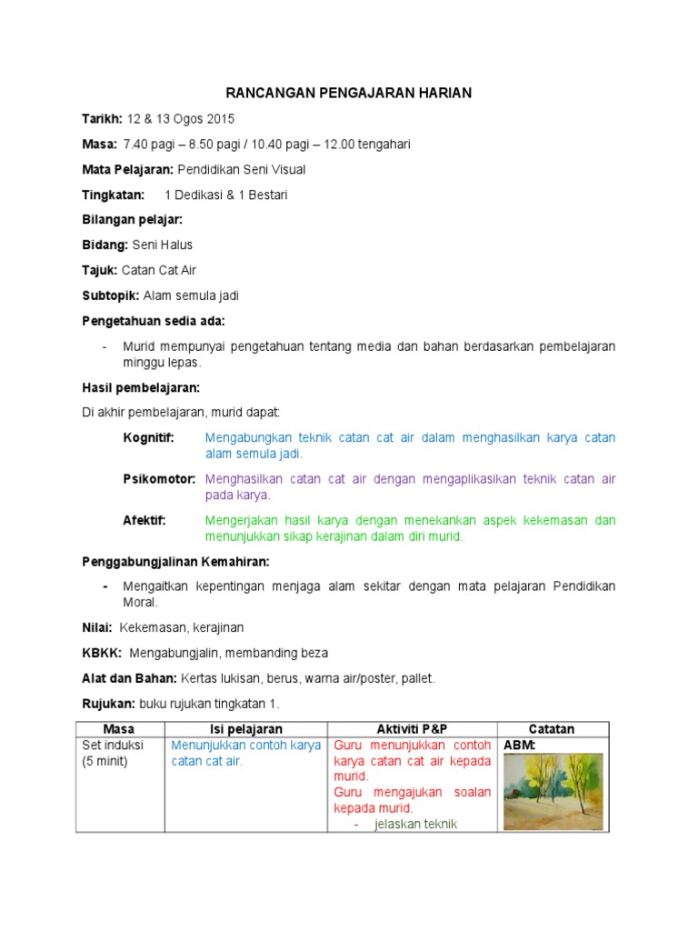 Catan Gambar Myseni from myseni.weebly.com aram akan menyerap sebahagian warna cat air dan menghasilkan kesan+kesan jalinan bertompok dengan spontan. Setelah lakaran dibuat pilih warna yang sesuai untuk diwarnakan. Untuk tujuan ini kertas yang telah dibasahkan hendaklah dihamparkan atas permukaan yang rata, supaya air dapat bertindak mengalirkan warna yang dimasukkan. Catan air merupakan suatu proses penghasilan seni dengan meggunakan bahan bewarna iaitu cat air yang dikarya pada permukaan rata. Rancangan pengajaran dan sukatan psv; Alat bantu mengajar lukisan dan catan lanskap these pictures of this page are about:teknik catan Setelah lakaran dibuat pilih warna yang sesuai untuk. Pewarna atau pigmen dalam bentuk kek atau tiub 2.